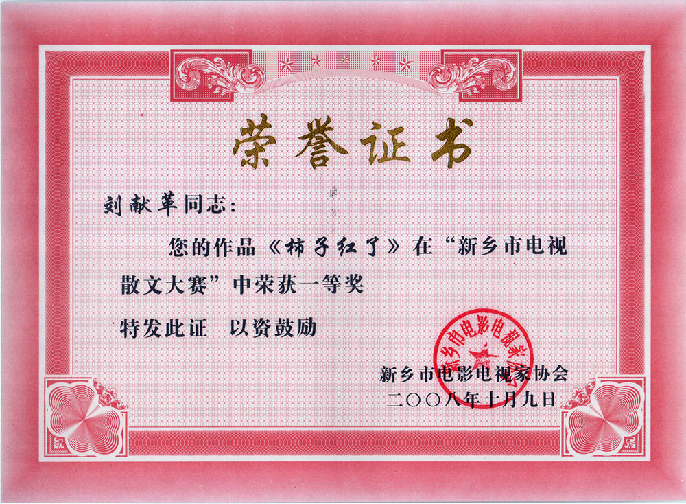 榮譽(yù)證書:電視散文《柿子紅了》獲一等獎(jiǎng)