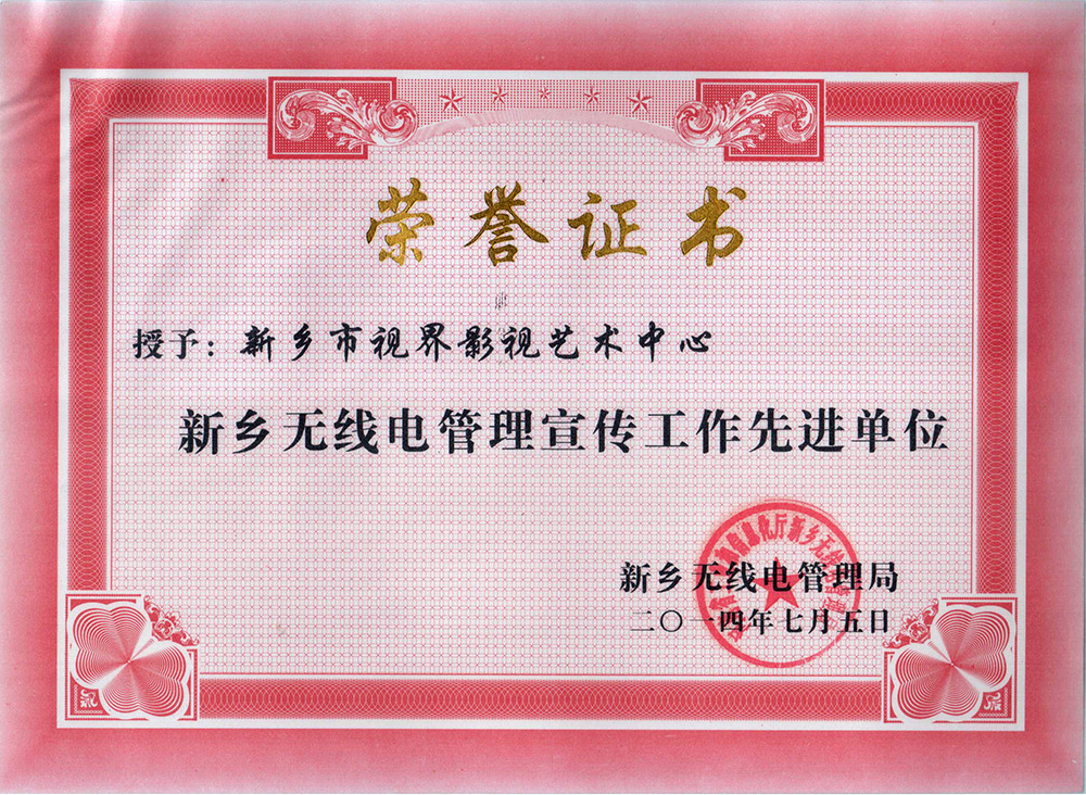 獎狀:新鄉(xiāng)無線電管理宣傳先進單位