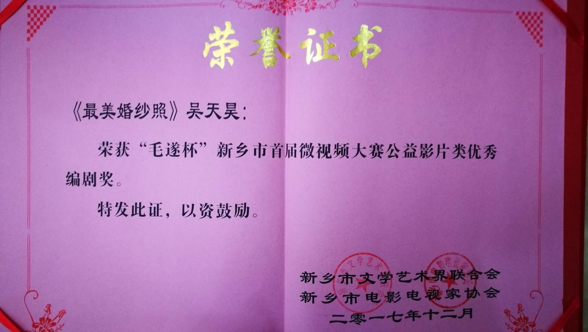 榮譽證書:《最美婚紗照》獲優(yōu)秀編劇獎
