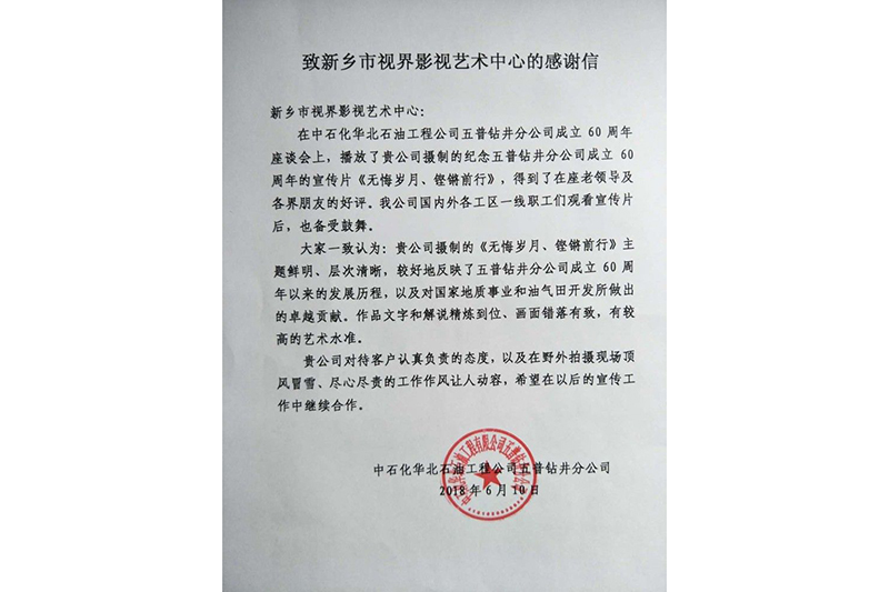 感謝信:來自中石化華北石油工程公司五普鉆井分公司