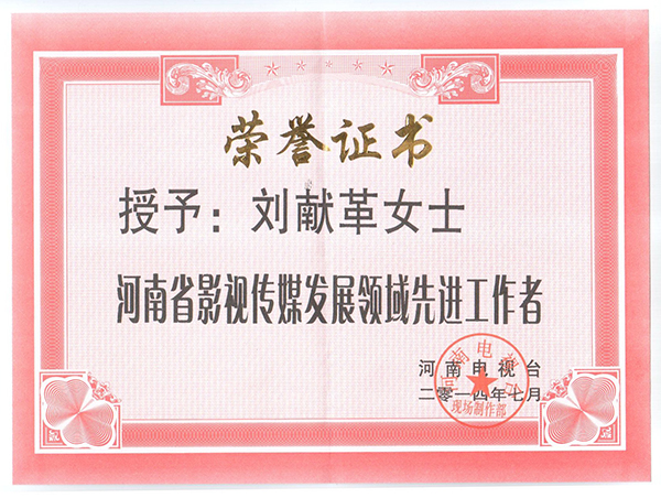2014年7月河南電視臺授予新鄉(xiāng)市視界影視藝 術(shù)中心法人代表劉獻(xiàn)革“河南省影視傳媒發(fā)展領(lǐng)域先進(jìn)工作者”榮譽(yù)稱號。