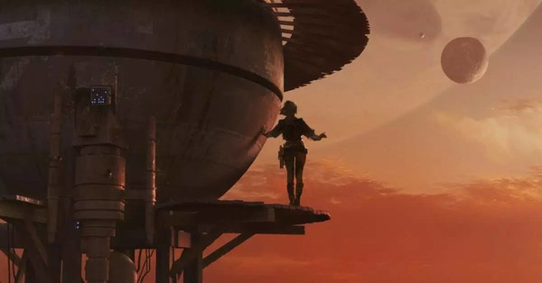 ?基拉(Kira)騎著她的飛行摩托遠離殲星艦殘骸。