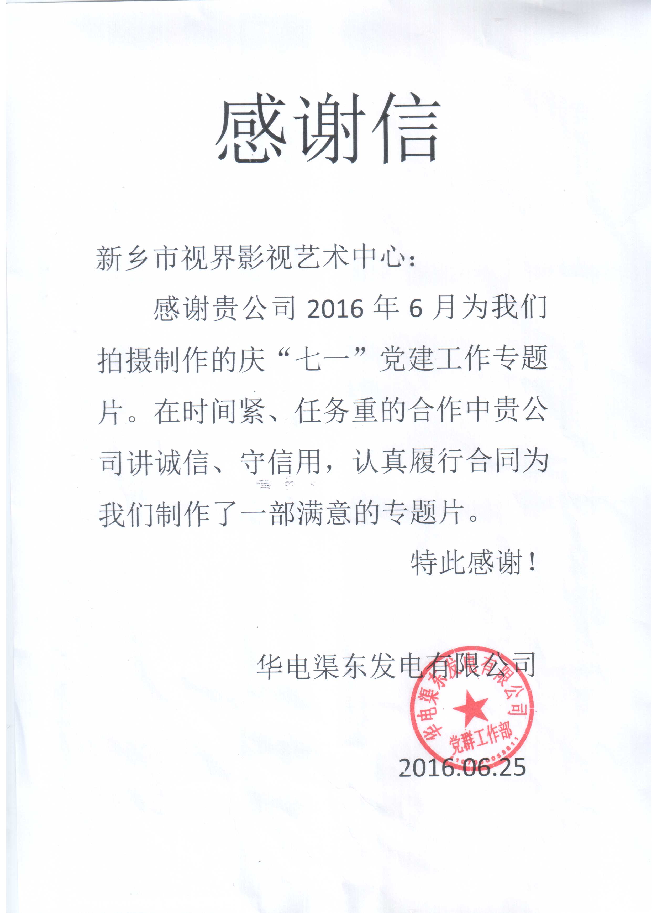 華電渠東發(fā)來的感謝信